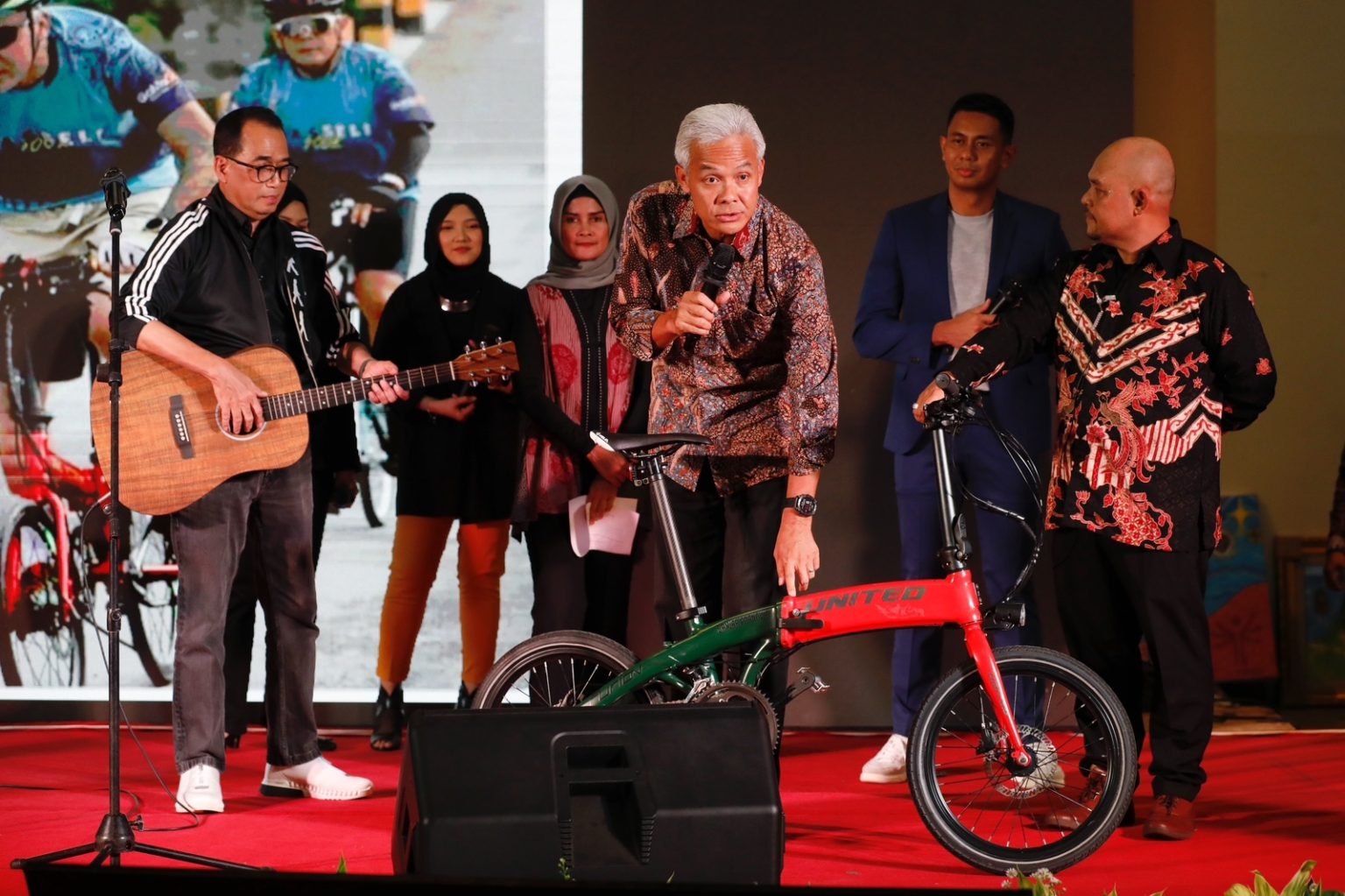 “Karena ini untuk anak-anak kita yang hebat ini, maka saya cari sepeda yang paling bagus. Saya agak sedih sebenarnya, makanya kalau nyumbangnya sedikit saya lebih sedih lagi,” canda Ganjar.
